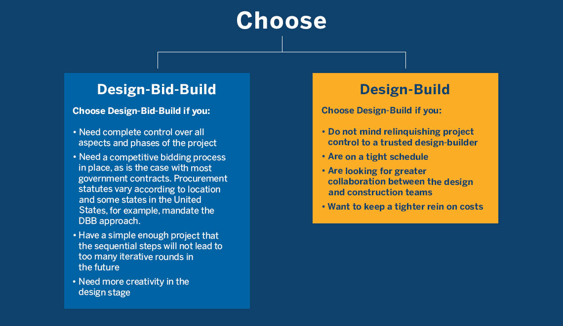 The construction industry too has dozens upon dozens of subspecialties, each of whom like to stay in their lane, a process that design bid build accommodates. The traditional DBB method has worked well for years but is seeing competition from a more nimble approach, the design build project delivery method. Design-build compresses the project lifecycle and time by encouraging overlap between the design and construction phases: construction can begin even when the design team is ironing out certain aspects of the design. Despite design-build’s growing popularity, the traditional design bid build approach continues to occupy key segments of the construction industry.