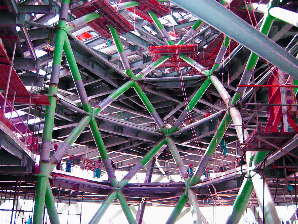 Main structural steelwork consumed more than 13,000 tons of material in addition to the metal decking. Steel skeleton consists of 702 nodes of external diagrids with an addition of 5 nodes of external dummy diagrids at level 18-18M-19 and 120 internal diagrid nodes at the intersection of the members. At the intersecting nodal points, the hollow members have met with offsets in two axes and floor beam met at the third axes along their surfaces. As none of the panels is coplanar to another, each node is unique and formed with a heavy thick cruciform punch through the plates. In order to minimise the member offsets at the nodal points, diagrid members have been oriented by the ‘bisection of bisecting planes’ method.