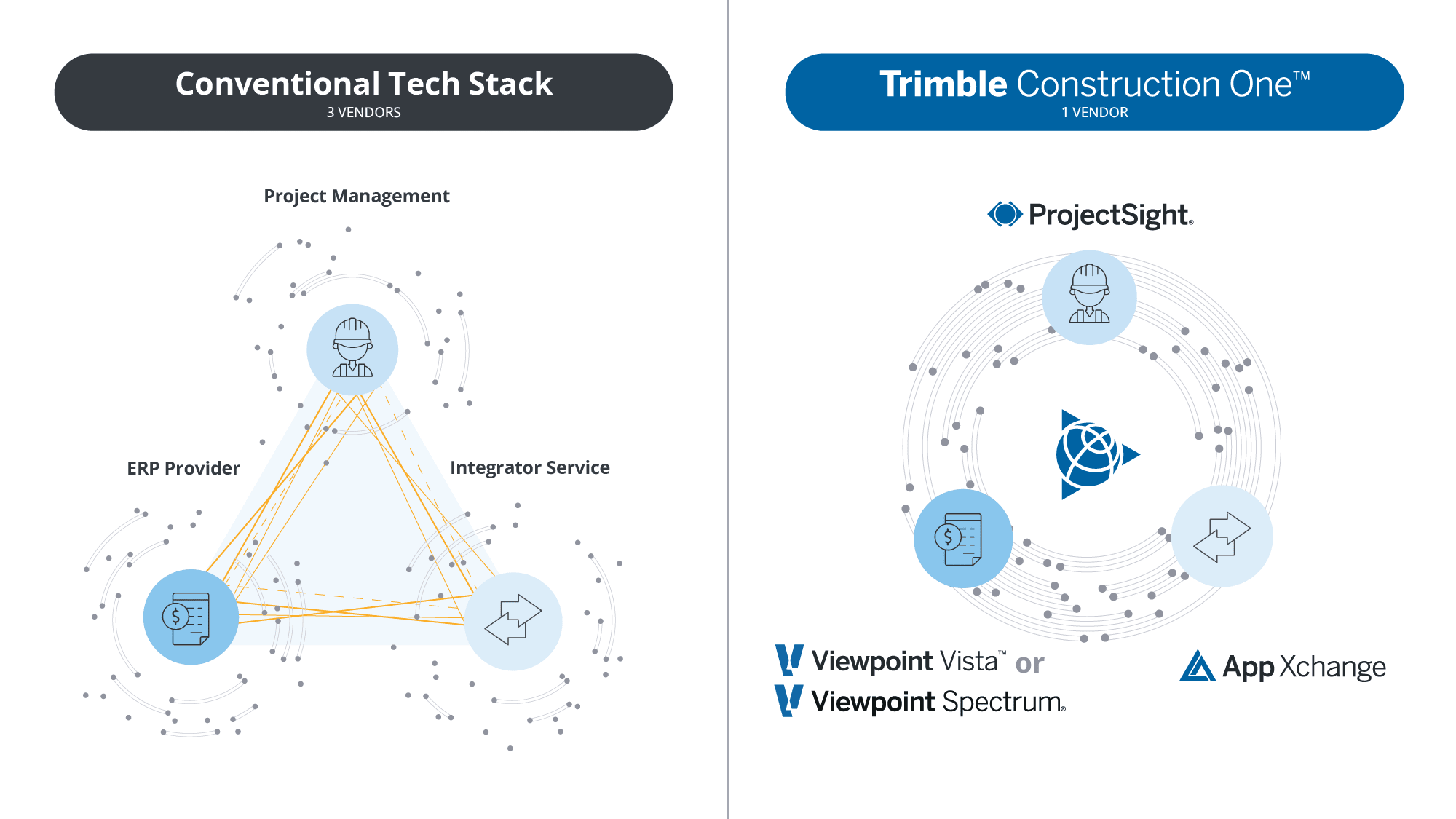 Trimble Construction One provides the ERP, integration and project management software in a unified system, ensuring data flows seamlessly and securely. No other software provider can provide this full suite of integrated tools for construction management under one roof.