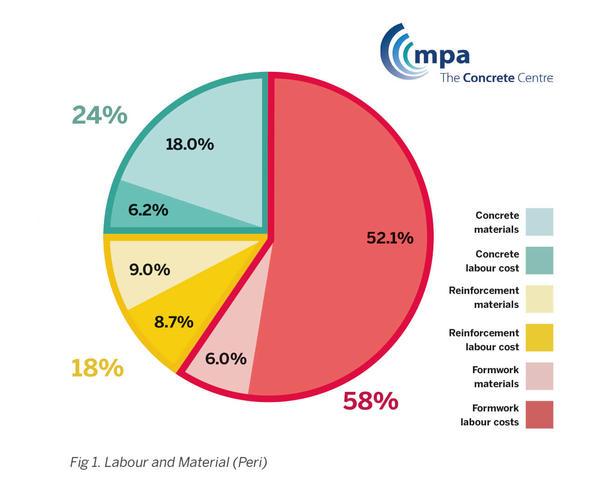 Looking at Fig 1. Formwork makes up approximately 50% -60% of the total volume of cost on a project, concrete materials about 18%, the labor on concrete totals about 5% to 6%, while the formwork materials makes up about 6%. The balance of reinforcement supply, prefabricated, and reinforcement labor costs are spread equally at around 9%.