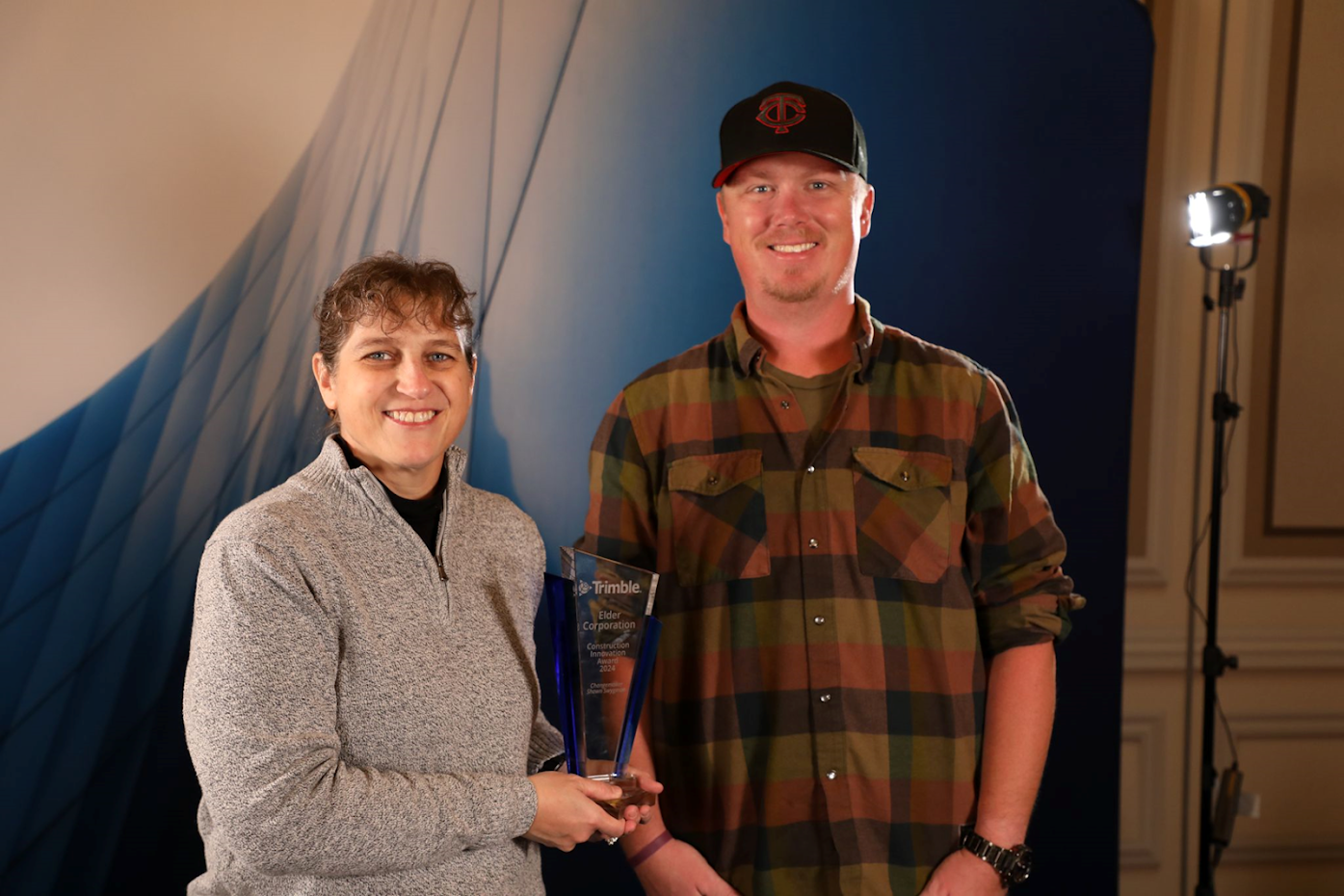 Bituminous Roadways earned the 2024 Trimble Construction Innovation Award in the “Connected Construction” category. Pictured are Kim Scales, IS technology manager, and Nate Larson, construction technologist.